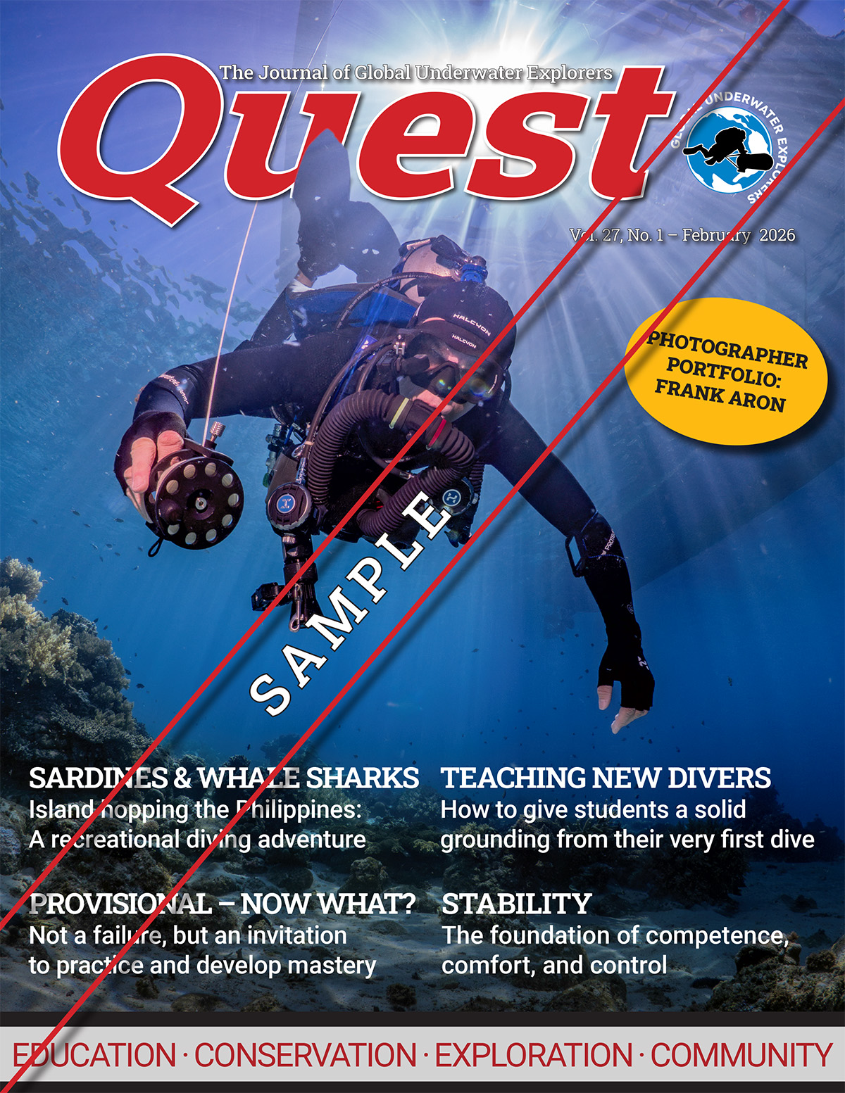 Quest is a quarterly magazine published by GUE that seeks to cultivate an understanding and appreciation of the underwater world and its component parts.