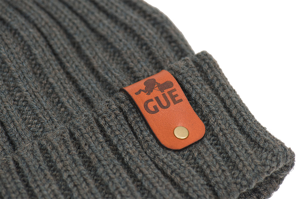 Keep warm with our vintage fisherman-style cable knit beanie! Accented with a laser engraved, riveted leather tag displaying the GUE diver we know and love, this eco-friendly beanie is made of a grey 50% recycled polyester and 50% acrylic yarn.