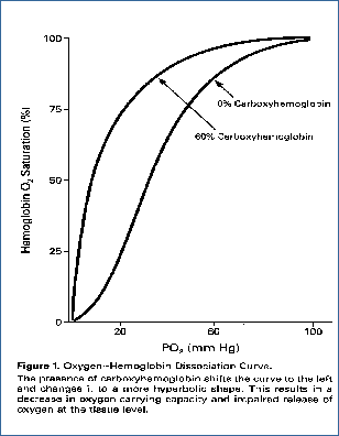 The primary mechanism behind the risk of carbon monoxide impact is twofold. First it binds to hemoglobin 250 times better than oxygen, making a compound called carboxyhemoglobin. This compound replaces the oxygen in the hemoglobin molecule and prevents the leftward shift of the Oxyhemoglobin Dissociation Curve. The increased affinity of hemoglobin for oxygen results in a decrease in oxygen carrying capacity and impaired release of the oxygen once it reaches the tissues. Non-smokers have about one percent carboxyhemoglobin while smokers have close to 15 percent. To illustrate the severely harmful effects of CO in the blood, imagine that an individual has 50 percent of their hemoglobin bound to CO. Compare this individual with another person who has lost half of their hemoglobin (due to severely bleeding ulcers, chronic gastrointestinal bleeding or massive injuries, for instance).The individual who has 50 percent of their hemoglobin bound with CO will die. But, the person who has a 50 percent loss of hemoglobin will still not experience hypoxia while in a resting state.