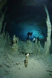 In January 2009, MCEP divers revisited this area, spending a total of 4 nights in the jungle and exploring and surveying 8,892 ft / 2,710 m of new cave passage. Nine dives were made entering from Sak U, Sak Ek and a nearby Cenote named Libby. For the first time, RB80 rebreathers were applied to the exploration of these relatively shallow and complex caves. In addition to extending the established main passages, a maze of decorated deeper tunnels was found intersecting these routes. Complementing the exploration and survey, photo documentation concentrated on some exciting archaeological discoveries.
