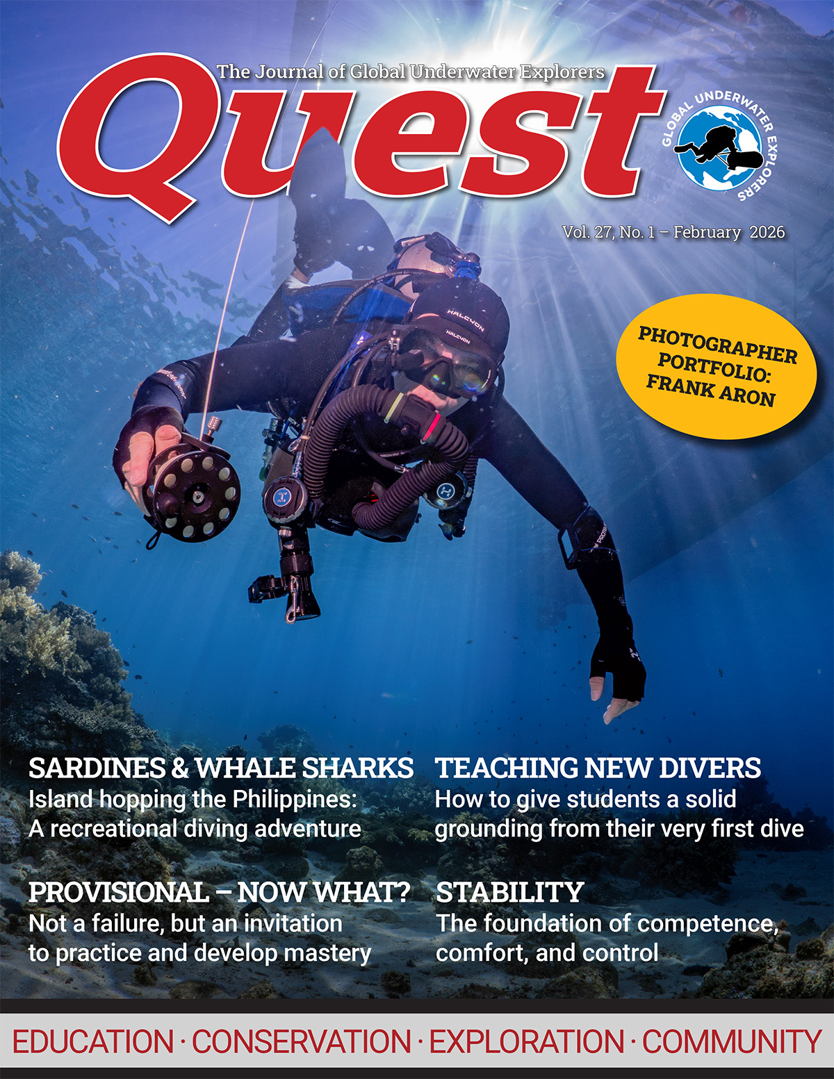 Quest is a quarterly magazine published by GUE that seeks to cultivate an understanding and appreciation of the underwater world and its component parts.