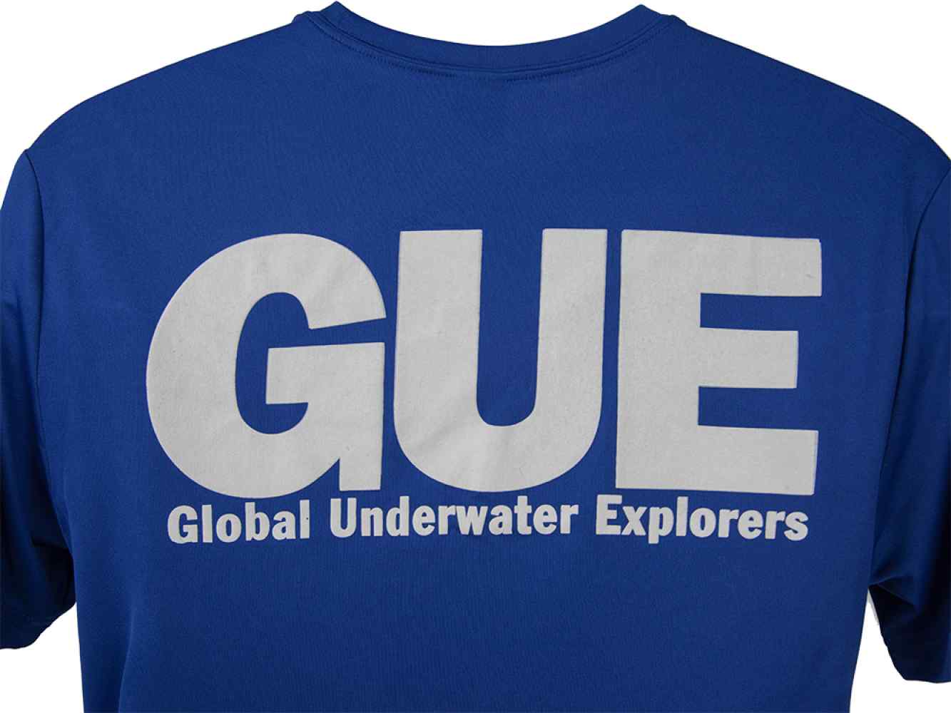 Recycled polyester and color-locking PosiCharge technology make this smooth-faced, odor-fighting, moisture-wicking tee outcompete other t-shirts. Royal blue shirt features white GUE logos on the front left chest and back.